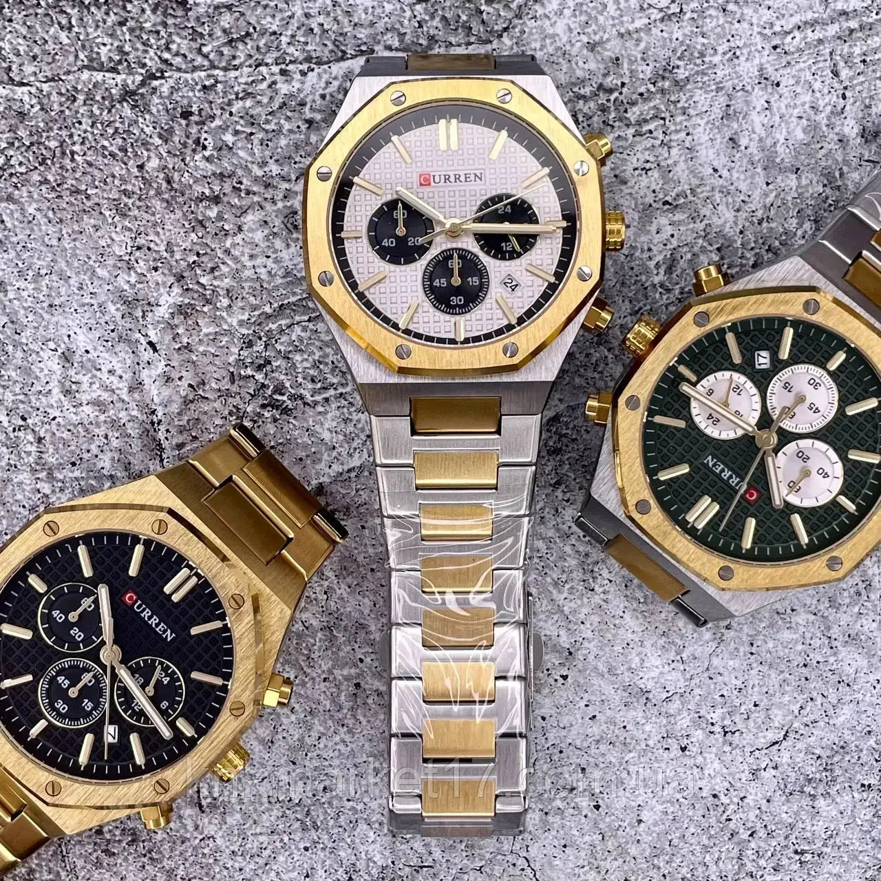 luminous hands, auto date, chronograph(seconds dial, minute dial,24 hours dial), stainless steel bracelet, octagonal design,waterproof 3 ATM.